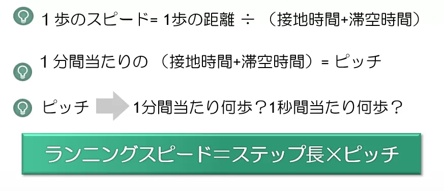 ですので、◆ランニングスピード=ステップ長×ピッチとなります。