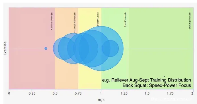 下の図は、スクワットで0.75~1.00m/s付近を狙った、いわゆる「筋力-スピード」にフォーカスした時期の実際の挙上速度を集計したグラフです。