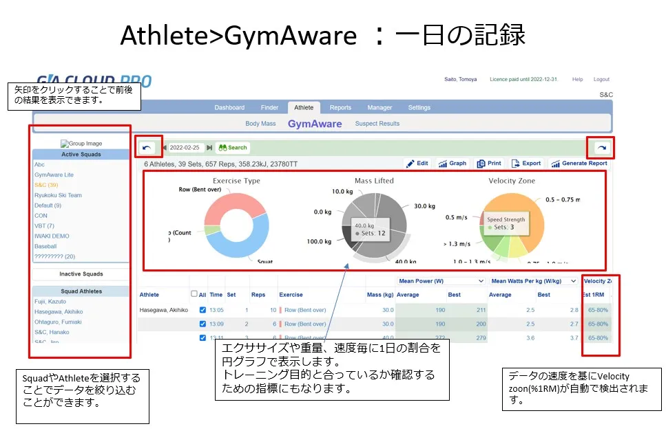 このように、GymAwareRSを使用したVBTはGymCloudPROを使用することで、さらに管理しやすく、選手のモチベーションを向上させてトレーニング効果・効率を高めることができます。