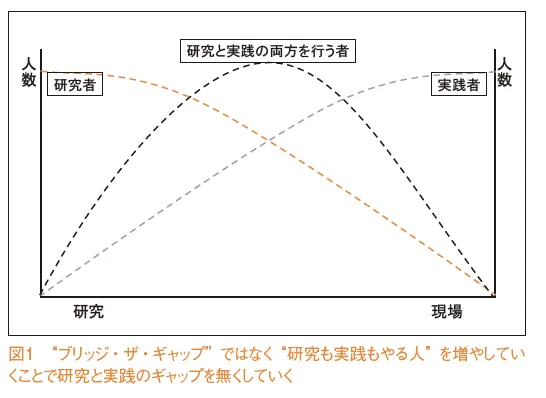 これまでの“ブリッジ・ザ・ギャップ”では、研究者と実践家の間を一生懸命つなごうと、いろんな試みが行われてきました。しかし、研究者はより研究的なところを目指し、実践家は研究よりも実践することが大事で、そこに時間を割こうとします。そこにブリッジを架けようとしても、なかなか難しかった。これからは研究も実践もやる人を増やしていくべきです。それができれば、わざわざブリッジを架けなくても済む。そこをJATI が担っていくべきだと思いますし、これからの目指すべき方向だと考えています(図1)。