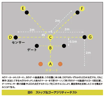 これまでの光信号を用いたアジリティーの研究では全力で右か左に走り抜けるY字アジリティーテストが主として用いられてきましたが、実際のスポーツではそれまでの動きを減速し一瞬停止してからの多方向への移動や後方への移動といった複雑な動作パターンが連続します。そうした特徴を踏まえ、前方のゲート通過直後に一瞬停止し4方向いづれかに反応した後、後方へ戻ってから再び前方に移動するというStop’n’Go(ストップ&ゴー)と呼ばれるテスト(図6)が開発されその信頼性が確認されています38)。