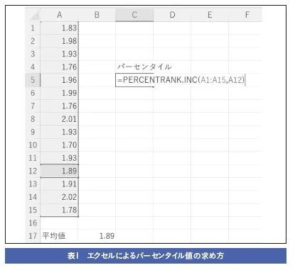 エクセルでパーセンタイル順位を求めるには、PERCENTRANK関数を用います。わかりやすくするために、簡単な具体例で見ていきましょう。表1は、大学サッカー選手15名の10mスプリントのタイムです。平均値は1.89秒です。これがパーセンタイルではどれくらいになるか見てみましょう。