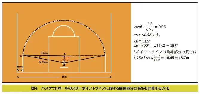 FBAルールによるバスケットボールのスリーポイントラインは、ゴールの中心から6.75mの半径で引かれた円の両端がサイドラインから0.9m内側にサイドラインと並行に引かれた直線と交わるように引かれています。したがって曲線部分が終わる点cからエンドラインと並行に引いた線が、ゴールの中心aからエンドラインに対して垂直に引いた直線と交わる点bまでの長さは、15m÷2-0.9m=6.6mとなり、直角三角形abcにおける∠θの大きさは、cos6.6/6.75=0.98ですから、逆三角関数arccos0.98から11.5°であることがわかります。すると直角三角形abcのもう一方の鋭角の大きさは78.5°ですから、スリーポイントラインの弧の中心角はその倍の157°となります。したがって、その360°に対する割合から、半径6.75mの円周全体に対する割合を求めると、スリーポイントラインの曲線部分の長さは18.65m≒18.7mであると計算されます(図4)。