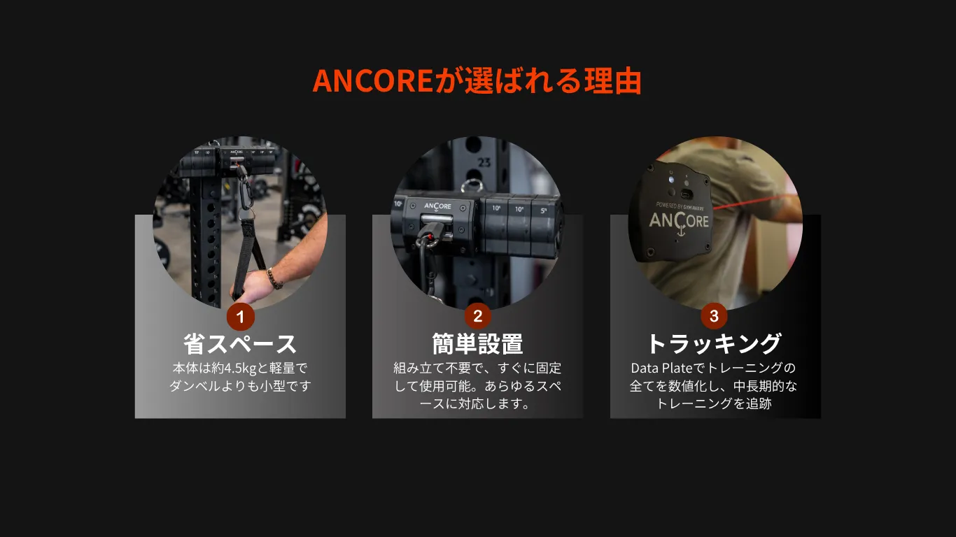 ANCORE PROはコンパクトな設置面積で220種類以上のエクササイズを実現可能。軽量なため、遠征先への持ち運びも問題ありません。さらに、Data plateと組み合わせることで速度、エキセントリック局面、パワー、レップ数、動作時間をリアルタイムで追跡!従来のケーブルトレーニングが進化します。