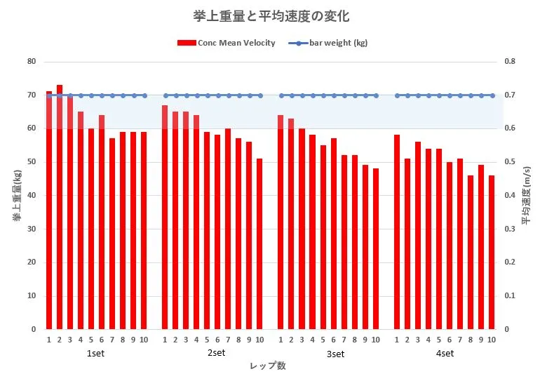重量は4セットとも一定です。しかし、挙上速度は1~2レップ以降は徐々に低下しているのがわかります。挙上している重量は同じですが、速度が変わりますから、実際に発揮している力の大きさは異なります。
