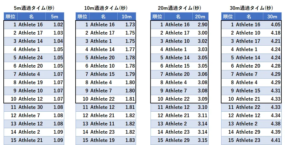 各区間ごとにランキングすると、常に速い選手や、特定の区間だけ速い選手などすぐに確認できます。部室内に掲示することで選手のモチベーションや向上心を高めることに繋がります。