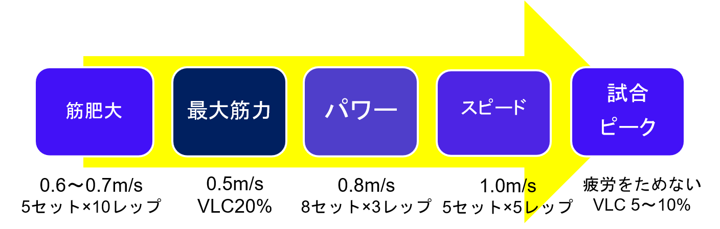 図1は従来の「筋肥大・基礎筋力期」⇒「最大筋力期」⇒「パワー期」⇒「スピード期」⇒「試合期」の流れをVBTの各変数で表した例です。