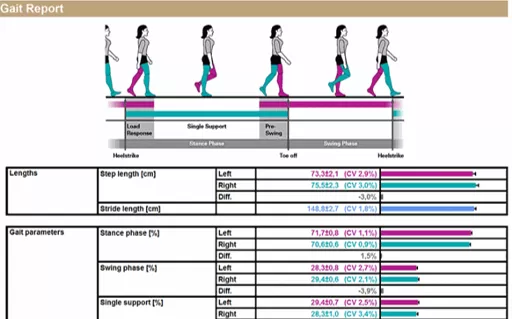 歩行を計測した際のデータを、良し悪しを含めてレポート形式で出力することができます。