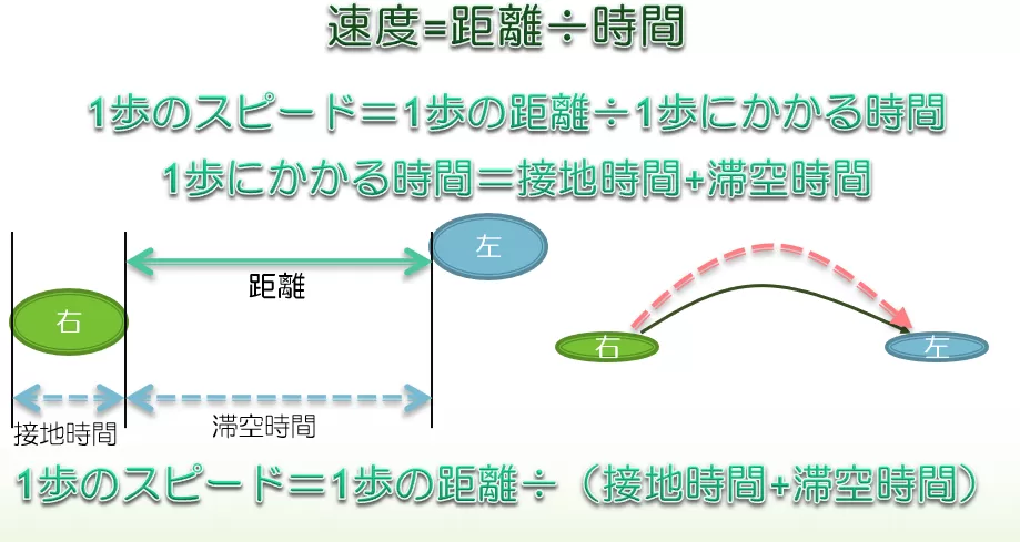 この一歩にかかる時間というのは、接地時間と滞空時間ですから、一歩のスピードは一歩の距離を接地時間と滞空時間を足した時間で割った値ということになります。