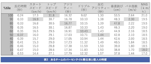 表3は、ある大学のサッカーチーム(33名)の1回の測定結果をもとにして作成したパーセンタイル順位表の例です。