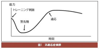 トレーニングの生物学的原理は、従来の多くのトレーニング理論と同様に本書においても、有名なハンス・セリエの汎適応症候群(GAS)の理論(図1)にあるとしていますが、その解釈がきわめて深く、単なるトレーニングにおける適応反応という生物学的根拠づけとして援用されているだけではなく、本書全体を通しての論理展開を導く原理となっています。