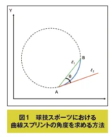 どうやってスプリント角度を調べたか、それは次のような方法です。図1の青い曲線で示したように、曲線スプリントの軌跡は円の一部である弧であると仮定し、次にスプリントの開始地点Aと終了地点Bを結ぶ直線ℓ₁をこの弧の弦(緑の直線)として、この弦という直線ℓ₁と、スプリント開始点における弧の接線(赤の直線)ℓ₂という2本の直線のなす角度をスプリント角度(θ)と定義しました。そして、ℓ₁とℓ₂のそれぞれのXY座標軸上の傾き(タンジェント)を求め、そこから傾きが既知の2つの直線のなす角度を求めるために、タンジェントの加法定理を用いてθを計算し、これを曲線スプリント角度としました。