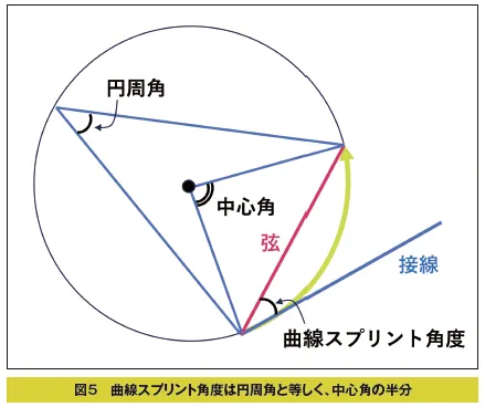曲線スプリントの角度を、図1で示したように、弧のスタート地点の接線と弦という直線が作る角度で設定すると、図5に示したように、「接線と弦が作る角度の大きさは、その弦に対する円周角の大きさに等しい」とする接弦定理と、「1つの弧に対する円周角の大きさは一定であり、その弧に対する中心角の半分である」とする円周角の定理から計算することができます。