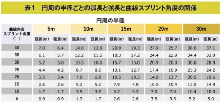 たとえば、同じ約10mという曲線距離を走りたい場合、半径が30mであれば角度は10°ですが、半径20mであれば15°、半径15mだと20°、半径10mだと30°というように半径を短く取ると曲線スプリント角度が大きくなります。