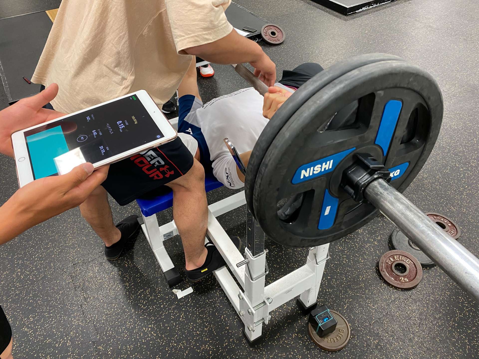 レッグプレスマシンなどのマシンも、ウエイトスタックのピンにストラップを固定することによって速度を計測しました。